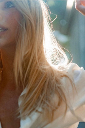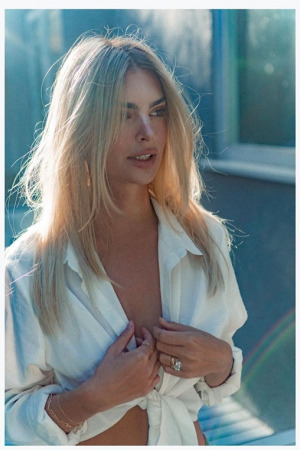 Звезда, которая недавно окрасила волосы в светлый цвет, снялась только выше пояса. Она дополнила образ распущенными волосами, несколькими тонкими золотыми браслетами и кольцами.