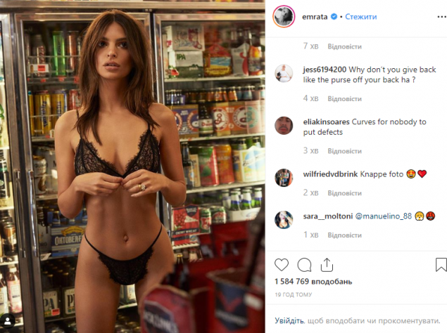 Модель и актриса Эмили Ратаковски снялась практически обнаженной в продуктовом магазине. Снимком звезда поделилась на своей странице в Instagram.