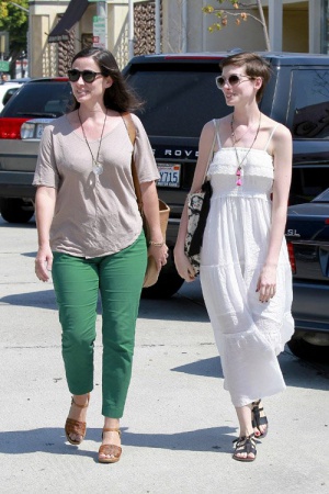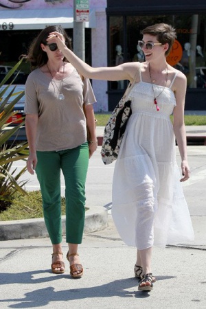 Энн Хэтэуэй встретилась с подругой в Западном Голливуде. Видимо актриса решила насладится не только обществом подруги но и теплым солнечным днем. Энн выбрала тонкий белый сарафанчик и добавила к нему легкую бижутерию. Девушки активно разговаривали по дороге к кафе.
