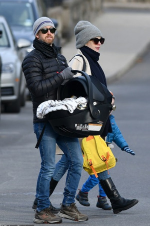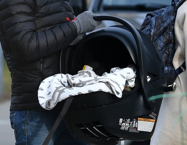 Именно муж актрисы Адам Шульман нес новорожденного ребенка в специальной люльке.