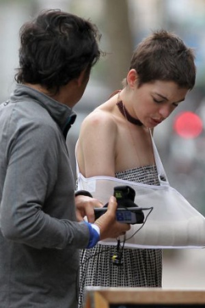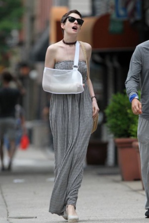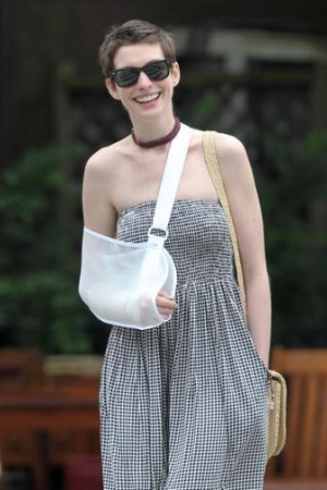 Энн Хэтэуэй в последнее время не узнать: она обрезала волосы и похудела. Теперь к ее новому облику добавилась еще и забинтованная рука. На днях Энн заметили в Бруклине. Ее правая рука была в бинтах и держалась на перевязи.