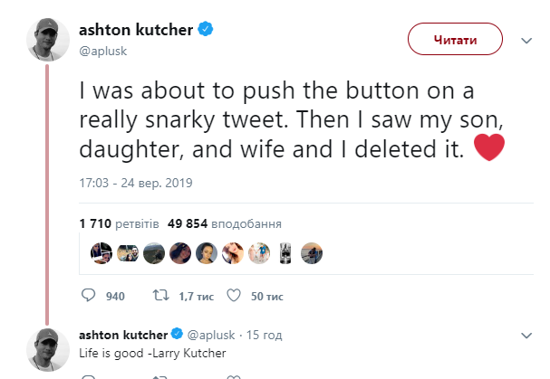 Катчер написал, что он "собирался нажать на кнопку и сохранить действительно язвительный твит".