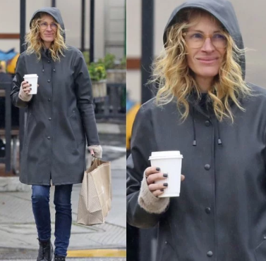 Джулия спокойно шла в сером плаще с капюшоном, из-под какого видно было ее вьющиеся волосы, узких джинсах, обуви на шнуровке и очках, а в руках несла чашку с напитком и пакет. И выглядела знаменитость, словно она на красной дорожке!