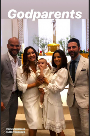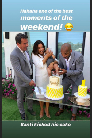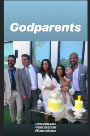 В Instastories Ева Лонгория показала, как прошли крестины Сантьяго. Актриса опубликовала несколько фотографий с крёстными малыша, а также забавный кадр, на котором Сантьяго копает ножкой свой праздничный торт.
