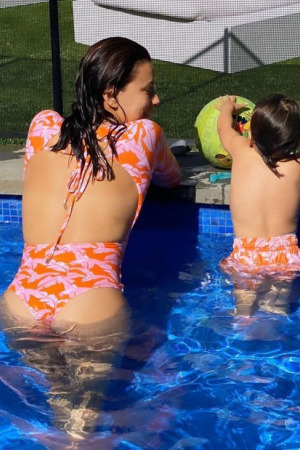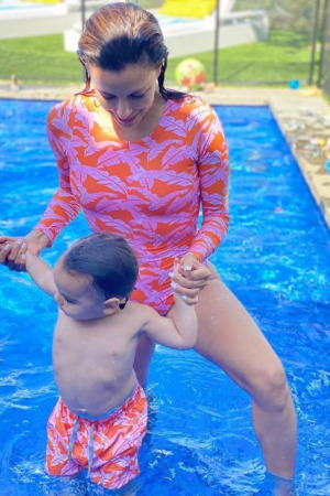 Звезда много времени проводит с годовалым сыном Сантьяго (19 июня мальчику исполнится 2 года). Ева решила искупаться с малышом в бассейне. Для этого она купила парный комплект для купания с ярким оранжево-розовым принтом.