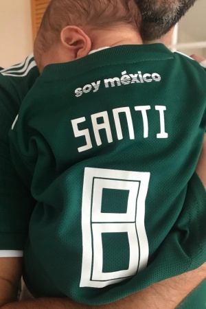Об этом свидетельствует новое фото в Instagram его звездной мамы. На снимке маленький Санти позирует на руках отца и они оба одеты в зеленые футболки в поддержку любимой команды. А у маленького Сантьяго на спине даже красуется надпись "soy mexico" - "Я мексиканец".