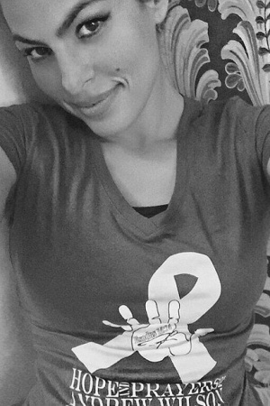 На черно-белом фотоснимке Мендес позирует в футболке "Hope and prayers for Andrew Wilson" ("Надеемся и молимся за Эндрю Уильямса"). Актриса помогает родителям собрать нужные средства для того, чтобы обсепечить полный курс лечения и восстановления полуторагодовалого Эндрю, который борется с сложнейшим заболеванием - нейробластомой.
