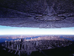 В фильме 1996 года на извечную тему "инопланетяне вторгаются на Землю" технологии пришельцев многократно превзошли человеческие, однако людям как-то удается взломать их компьютер и взорвать гигантский корабль-матку. По ходу дела нам сообщают, что корабль этот обладает массой в четверть массы Луны и находится на геостационарной орбите Земли – в 10 раз ближе, чем естественный спутник нашей планеты.
