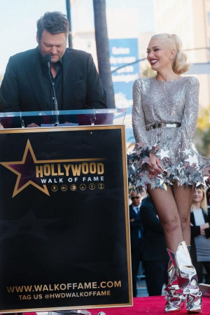 Для торжественного мероприятия Гвен Стефани выбрала мини-платье от бренда Christian Cowan, которое было выполнено в серебристом цвете, расшито пайетками и звездами. Образ певица дополнила черными сетчатыми колготками и сапогами Le Silla Andy.