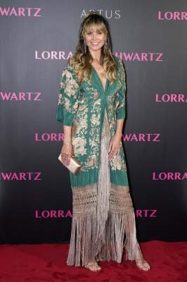 Для мероприятия Хайди выбрала платье-кимоно изумрудного цвета с золотой вышивкой и бахромой. Образ дополнили золотистые босоножки и атласный клатч. Стилисты убрали часть волос звезды в высокий хвост, а остальные распустили и уложили легкой волной.