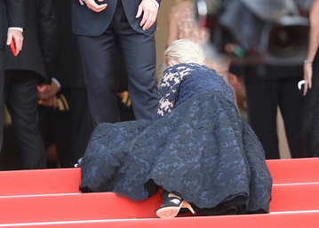 Поднимаясь по ступеням Фестивального дворца в Каннах, Хелен Миррен запуталась в подоле длинного кружевного платья и упала на бедро. Инцидент произошел перед премьерным показом бельгийской ленты Незнакомка.
