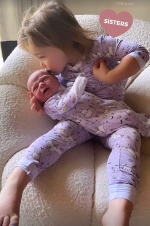 На второй фотографии малышка Мэй уже на руках у своей старшей сестрички Бэнкс. Обе одеты в одинаковые пижамы.