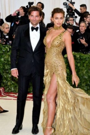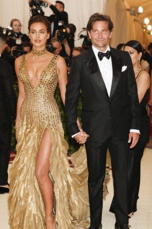 32-летняя россиянка Ирина Шейк пришла в золотом платье от Versace, расшитом пайетками, с глубоким декольте и высоким разрезом. Платье, эффектно подчеркивающее фигуру модели, дополнял чокер на шее, а также золотые босоножки на высоких каблуках.