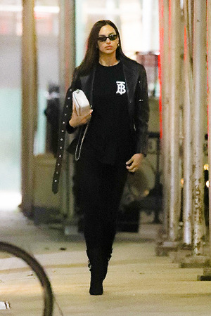 Одета звезда была в черную футболку от Burberry, брюки и куртку-косуху в цвет.