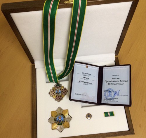 Орден преподобного Сергия Радонежского – общецерковная награда Русской православной церкви, имеет три степени. Учрежден Священным синодом Русской православной церкви 26 декабря 1978 года. При награждении вручается знак ордена и грамота. Носится на левой стороне груди. Выполнен в виде четырехконечного креста, в центре находится круглый медальон с изображением преподобного Сергия Радонежского. Девиз ордена – Смирением возвышаемый (наносится на оборотную сторону).