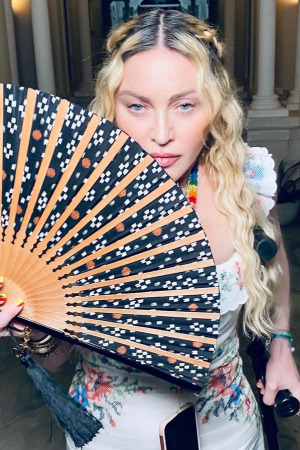Мадонна завершила look большим количеством золотых браслетов на руке. А поскольку на улице жарко, певица держала веер, который показала в кадре.
