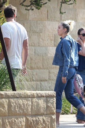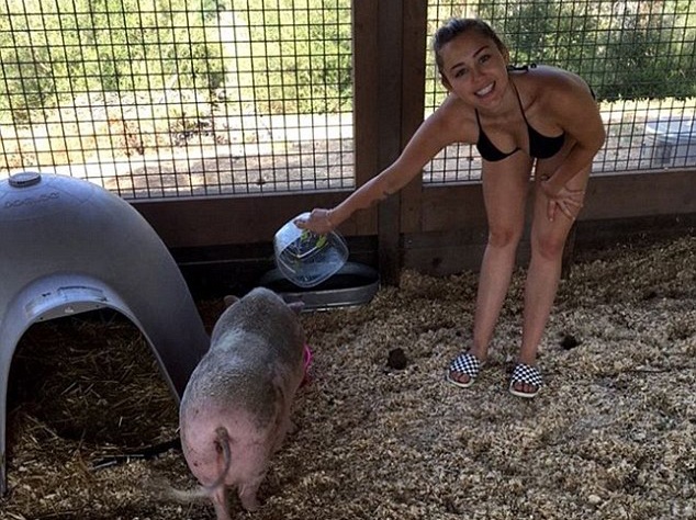 Майли и ее любимый Лиам Хемсворт отправились на отдых в загородный домик в Малибу, где певица решила помочь с хозяйством. Сайрус в черном бикини пошла кормить свиней.