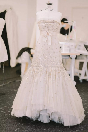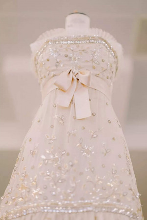 Вечернее платье создано из бежевой органзы, украшено золотыми и серебряными пайетками, переплетенными в тонкие цветочные ветви. Бюстье наряда окаймлено изящной складкой из тюля, украшенной пайетками и атласной тесьмой. Невероятный образ дополняет атласный бант вокруг талии, плиссировка и тысячи оборок.