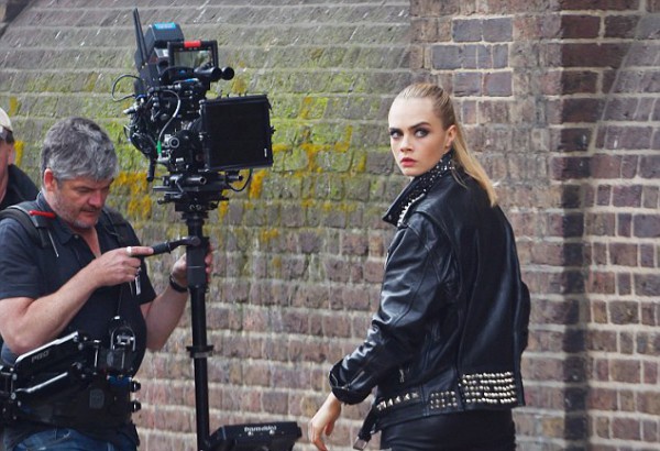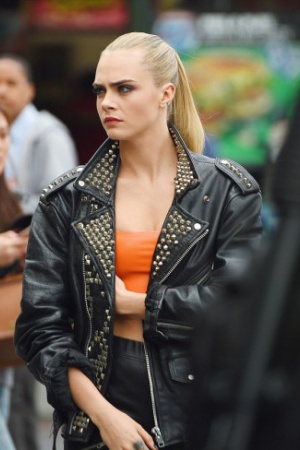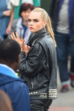 Модель Кара Делевинь на съемках первого рекламного ролика для Rimmel London появилась одетая в кожу с головы до ног. Девушка примерила образ рок-звезды, надев массивную куртку с шипами, кожаные штаны и латексный оранжевый топ. Кара дополнила образ дымчатым макияжем и сдержанной прической конский хвост.