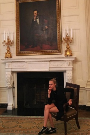 Кара Делевинь известна публике своими эпатажными выходками, скандальными заявлениями, отношениями с женщинами. Именно потому не удивительно, что даже в таком серьезном месте, как резиденция Президента США, она вела себя со свойственным ей задором.