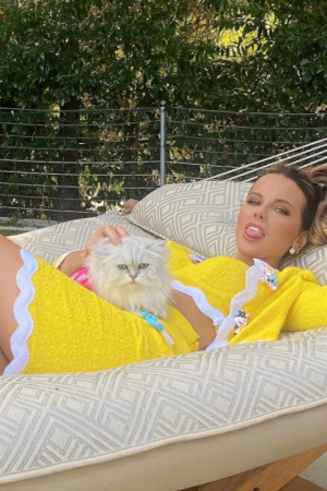 Дополнили лук звезды фильма "Другой мир" массивные туфли от бренда Valentino на платформе и каблуке, а также ее любимая прическа - высокий хвост с бантом, в стиле Брижит Бардо. На лице у Кейт был идеальный макияж. Также часто актриса публикует в Instagram фото и видео со своими домашними любимцами и на этот раз на фото с ней был запечатлен белый кот, одетый в розовую кофту.