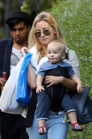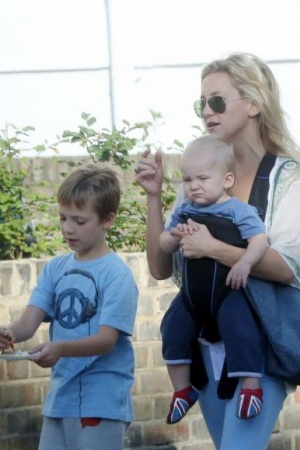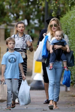 Кейт Хадсон на днях гуляла с обоими сыновьями – 8-летним Райдером и годовалым Бингэмом – по Лондону. Вся компания заглядывала в ресторан Giraffe, а потом, видимо, ходила за покупками. По дороге домой их отловили фотографы и неоднократно запечатлели.