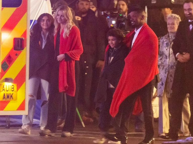 Звезду в черном костюме и с красным пледом сверху сфотографировали папарацци. Вместе с ней был актер Джейми Фокс.