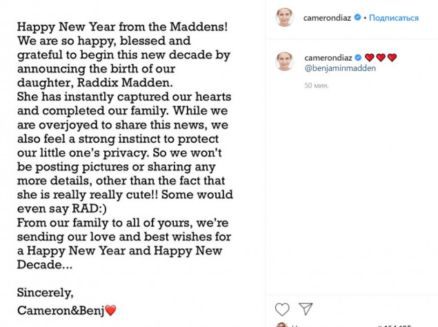 "С Новым годом от Медденов! Мы так счастливы и благодарны, что начали новое десятилетие, объявив о рождении нашей дочери Реддикс Мэдден. Она мгновенно покорила наши сердца и пополнила нашу семью", – сообщила на своей странице в Instagram Кэмерон Диаз.