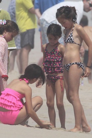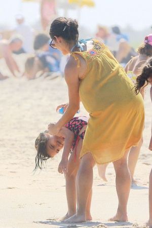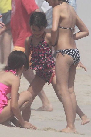 Пока Сури возилась в песке и играла с подружками, Кэти внимательно следила,чтобы дочь не обгорела под ярким солнцем.