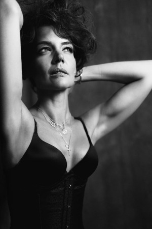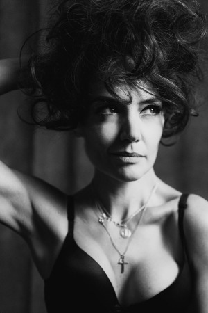 Кэти на черно-белых снимках демонстрирует совершенно новую для себя прическу, а именно объемные локоны, созданные ведущим парикмахером актрисы DJ Quintero с Serge Normant Salon в Нью-Йорке. Чувственности образу добавили стрелки и длинные ресницы Холмс.