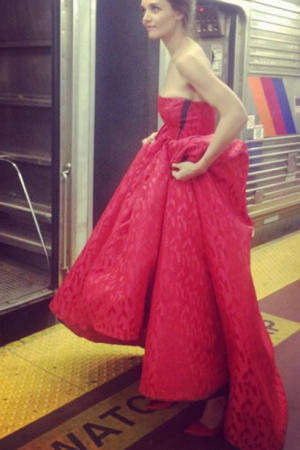 Чтобы миновать нью-йоркские пробки актриса спустилась в подземку в вечернем платье – пышном, красном.