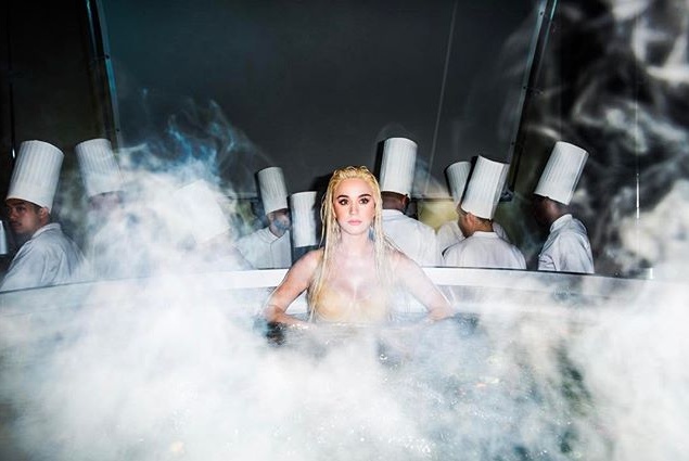 На этот раз Кэти пришла в голову кулинарная тема. Она снялась в фотосессии в качестве блюда. На одном из снимков, которыми поделилась Перри, она позирует на дощечке для готовки полуобнаженная, присыпанная овощами и специями. На втором фото певица запечатлена в варящемся котле. Что ж, оригинально!