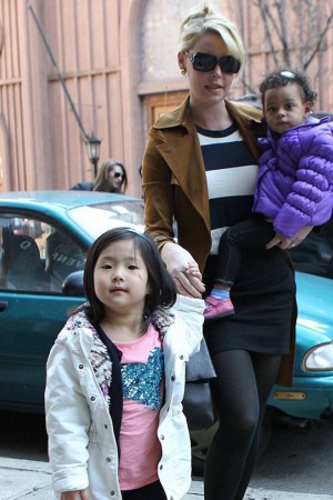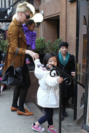 Кэтрин Хайгл была замечена в Нью-Йорке, когда со своей семьей - дочерьми Нэнси и Аделаидой, а также мужем Джошем Келли, посетила детское кафе.