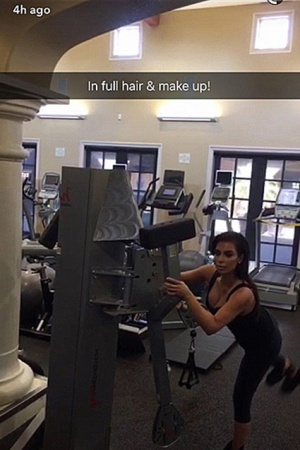 Об этом Ким сообщила своим поклонникам в социальной сети Snapchat, опубликовав фото и видео с тренировки, на котором видно, что Кардашьян занимается не только с идеальным мейкапом, но также с прической.