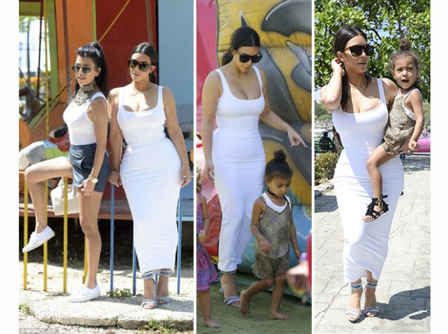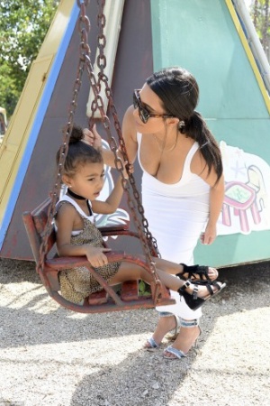 Для прогулки с дочерью Ким Кардашьян выбрала белое платье в пол, которое плотно облегало фигуру девушки и открывало зону декольте.