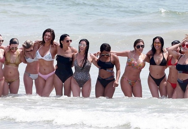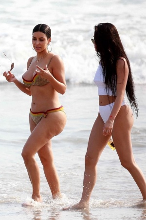 Маму двоих детей с сестрой Кортни и подружками запечатлели на пляже. Жена Канье Уэста щеголяла в стильном бикини от Christian Dior, демонстрируя целлюлит.