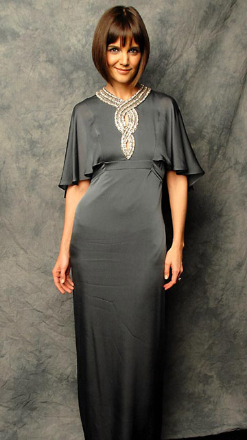 На 29-летней супруге Тома Круза было платье из серого атласа, отделанное стразами, в котором она выглядела просто и элегантно.