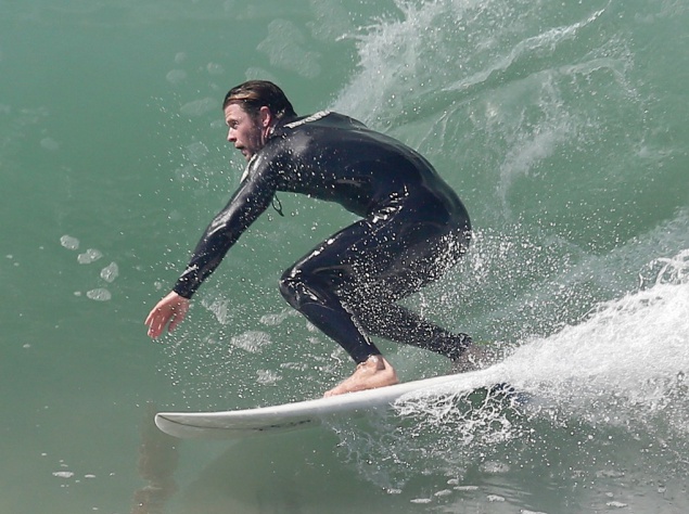 Пока 30-летний Крис ловил волну, демонстрируя свое Торовское телосложения в облегающем гидрокостюме, его жена осталась на берегу, прогуливаться по теплому песку.