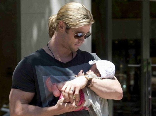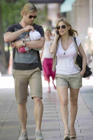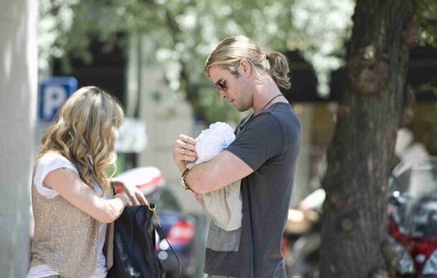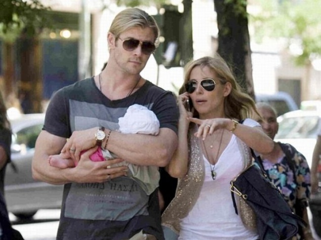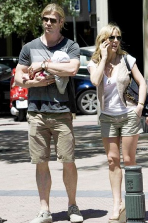 Крис Хемсворт продолжает расхаживать по Мадриду с малышкой Индией на руках и женой Эльзой Паатаки рядом.