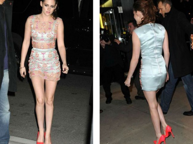 Не успели критики подзабыть жуткое кружевное платье Кристен Стюарт телесного цвета, в котором она появилась на премьере заключительной части "Сумерек" в Лос-Анджелесе (подробности), как актриса вновь ошарашила публику экстравагантным нарядом. На очередном показе фильма "На дороге" Кристен выглядела довольно странно в атласном полупрозрачном бирюзовом наряде и оранжевых туфлях.