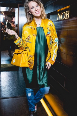 Ксения Собчак, которая пришла на мероприятие без мужа, выглядела потрясающе: нежное лицо почти без макияжа, в зеленом платье-комбинации, желтом жакете с вышивкой и сумочкой в тон.