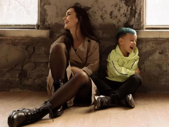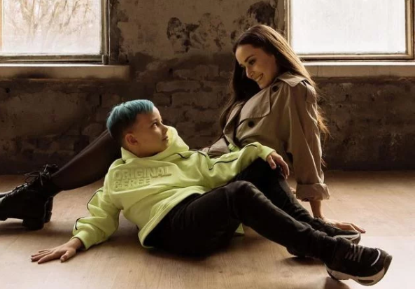 Ее сын Платон одет в яркую кофту желтого цвета и черные брюки, совмещенные с кроссовками черного цвета. Акцент в его образе сделан на необычной прическе – волосы мальчика окрашены в синий цвет.