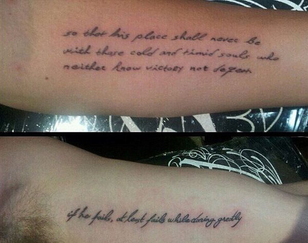 Он нанес на руку цитату из речи президента Рузвельта 1910 года. По "невероятному совпадению" у его 19-летней возлюбленной на конечности вытатуирована цитата из этой же речи – правда, сама фраза другая.