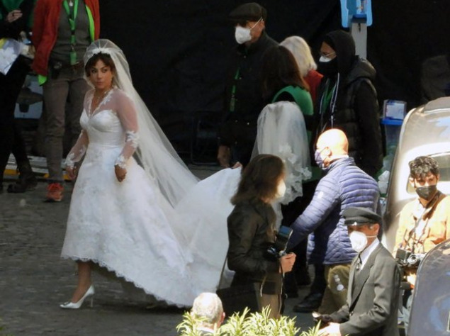 Папарацци заметили Леди Гагу в двух свадебных образах: гипюровом платье с белой накидкой и черным поясом, и роскошном платье с длинной фатой, в котором она шла под венец.