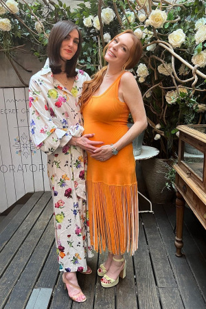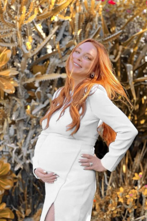 На фотографиях 36-летняя Лохан изображена улыбающейся в оранжевом обтягивающем платье и белом платье. Линдси нежно обнимает уже заметно выросший животик: