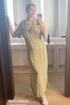 Снимок Линдси распространила в Instagram-stories. На нем она предстала в длинном сарафане цвета хаки с орнаментом. Актриса обула кроссовки, собрала волосы и дополнила аутфит золотыми украшениями.
