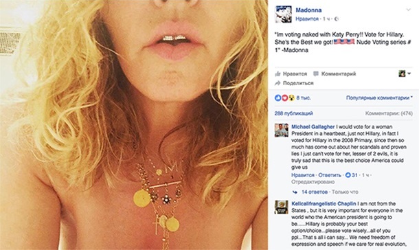 "Я голосую голой вместе с Кэти Перри. Голосуйте за Хиллари. Она лучшее, что у нас есть", - подписала Мадонна.