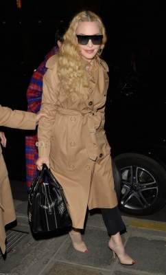 На днях певицу засняли в Париже, куда она приехала в рамках Недели моды. На эпатажной певице были темные очки, песочный тренч, туфли в тон. Волосы Мадонна распустила и заколола невидимками. Согласись, в этой женщине сложно узнать звезду мировой величины.