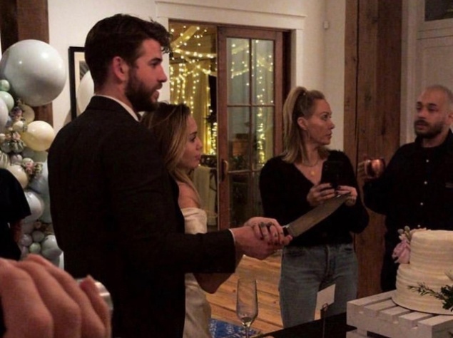 На другом же кадре Лиам и Майли собираются резать праздничный торт. При этом певица одета в белое платье, напоминающее свадебное.