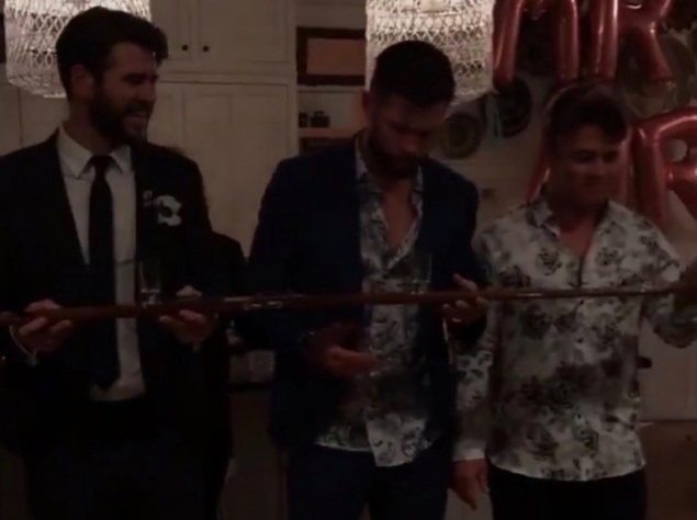 Так, один из друзей пары в Инстаграм-сториз поделился кадрами с церемонии бракосочетания. На первом фото можно заметить Лиама в костюме с бутоньеркой, который поднимает тост вместе с друзьями и старшим братом Крисом. А на втором — большие шары в виде букв с говорящими надписями "Мистер" и "Миссис".